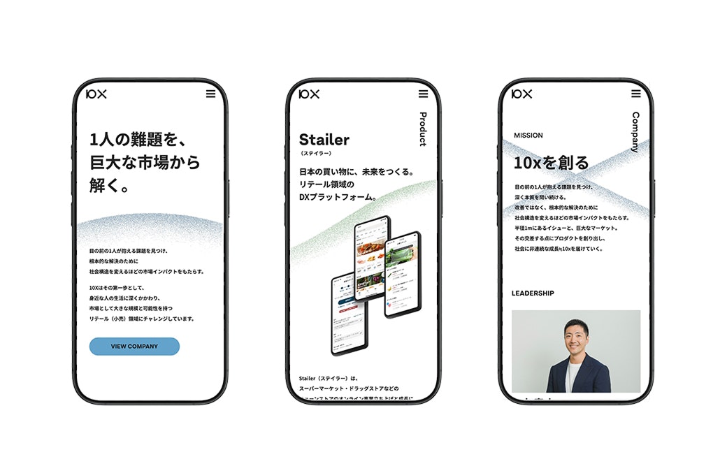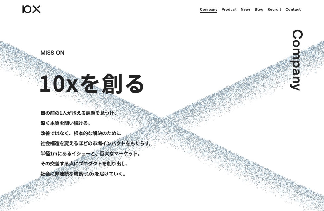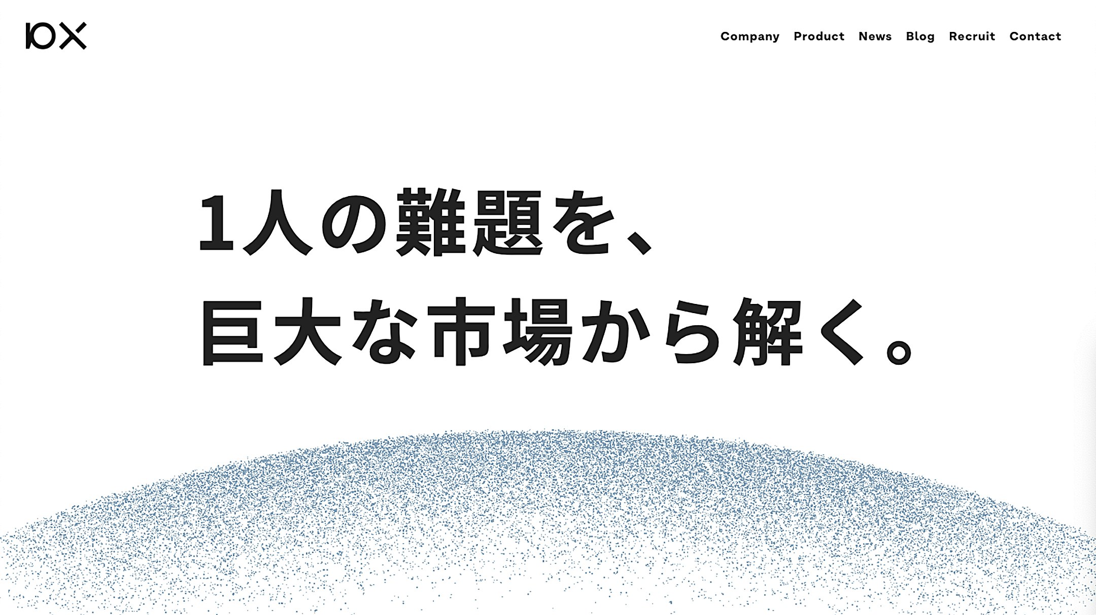 10Xのコーポレートサイトリニューアルを担当しました。 10Xのミッションをベースに、より解像度の高いメッセージを開発し、それをコンセプトにしたシンプルで明快なデザインに。粒子の演出は、10Xが大事にする“ひとりの課題”を一粒の粒子と捉え、巨大な市場や新しい価値を生む大きなうねりへの変化を表現しています。