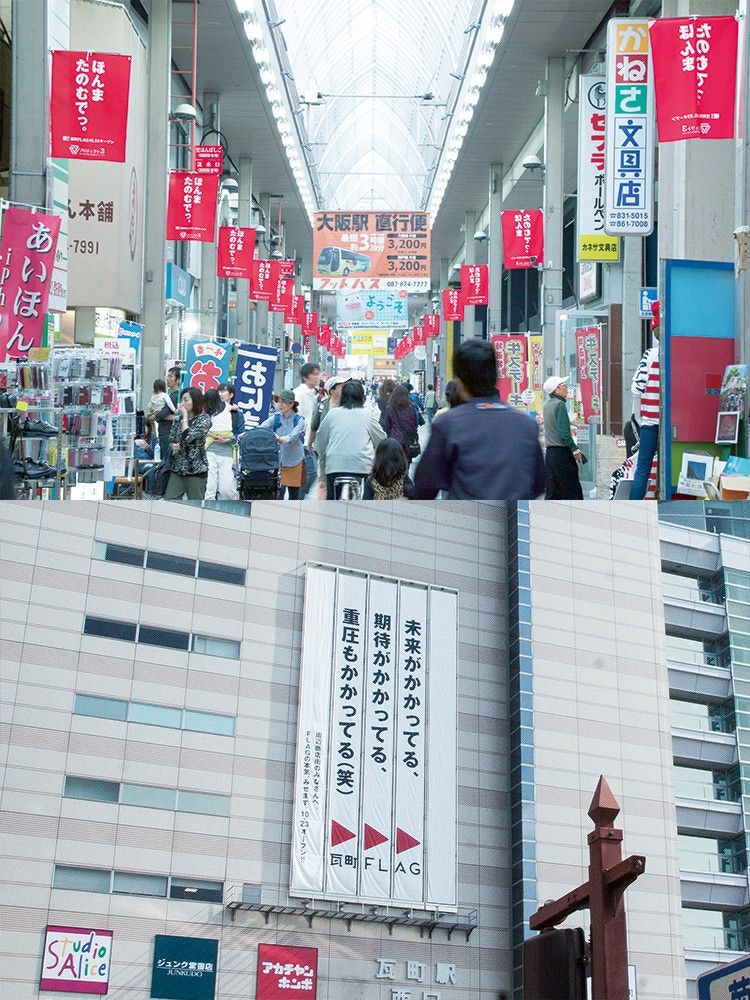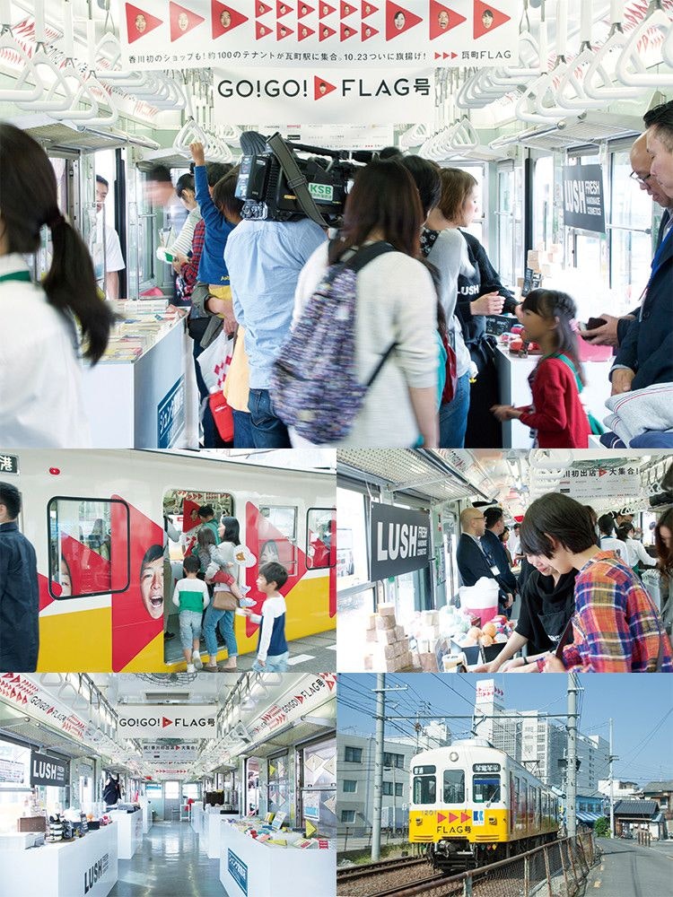 プロモーションでは「街の旗揚げ」をテーマに、街が生まれ変わるという期待づくりに挑戦。広告ビジュアルは近隣の住民に参加を募って撮影イベントをおこない、結果100人以上の方に街の顔になっていただき、「ことでん」車両を舞台に、世界初(たぶん)となる電車内でのポップアップショップを展開したり、近隣商店街と広告を使ったメッセージ交換を行ったりと、様々な形で街に話題を届けていきました。