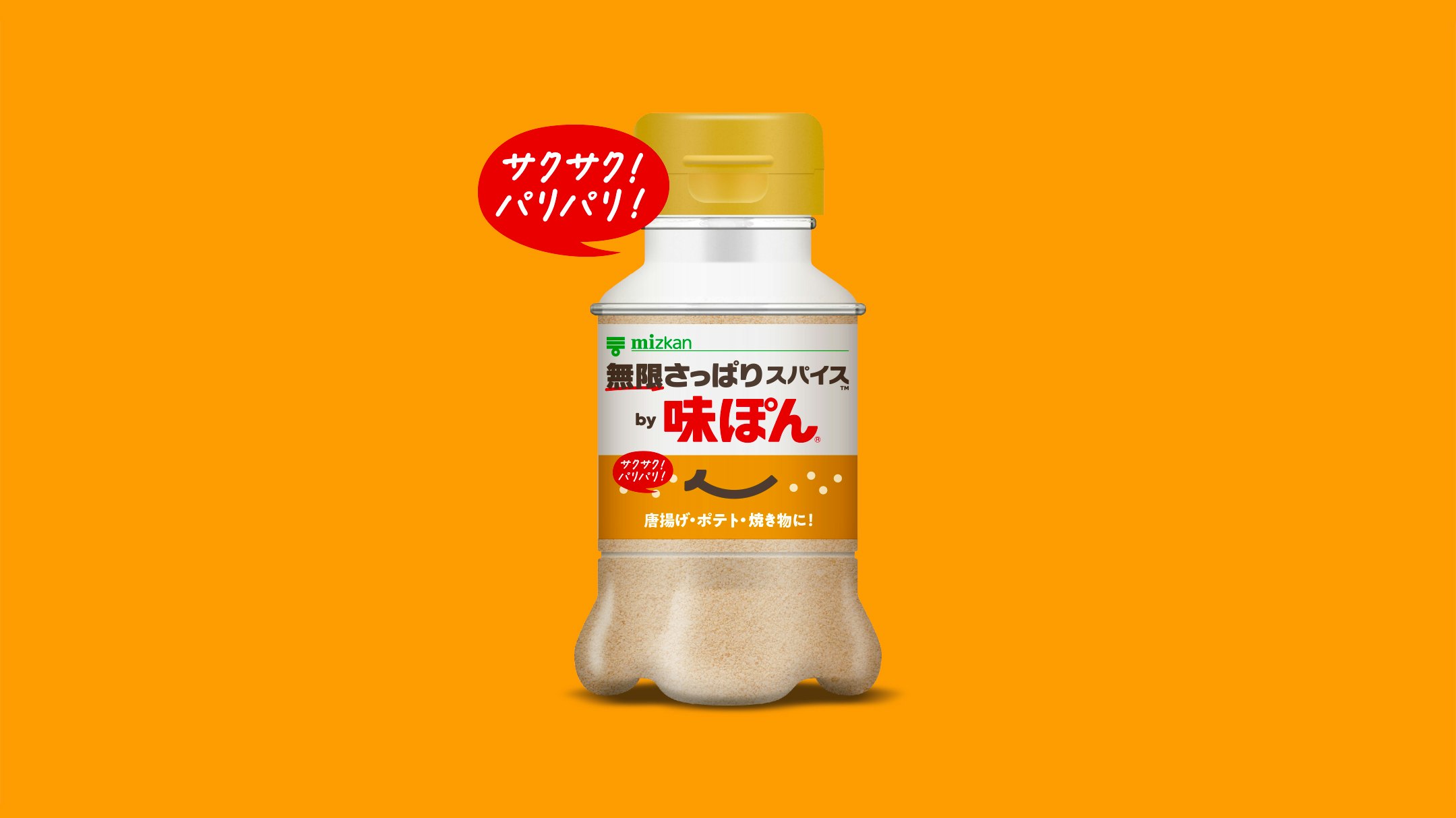 味ぽんのさっぱり味を、かけるだけの手軽さでサクサク・パリパリの食感をそのままに楽しめる、「無限さっぱりスパイスby味ぽん」のパッケージデザインを担当しました。自分のアイデアで様々なものに試してみたくなること喚起するために、ワクワクや楽しさを叶えてくれる“相棒”のような存在をイメージし、小さくコロッとした容器を生かしたキャラクターのようなたたずまいで表現しました。また、商品特有のやつみき感を「無限」という言葉で商品名も冠すことで、より伝わりやすいコミニュケーションにこだわりました。先行発売から4日間で完売、SNSでも大きな話題を生みました。