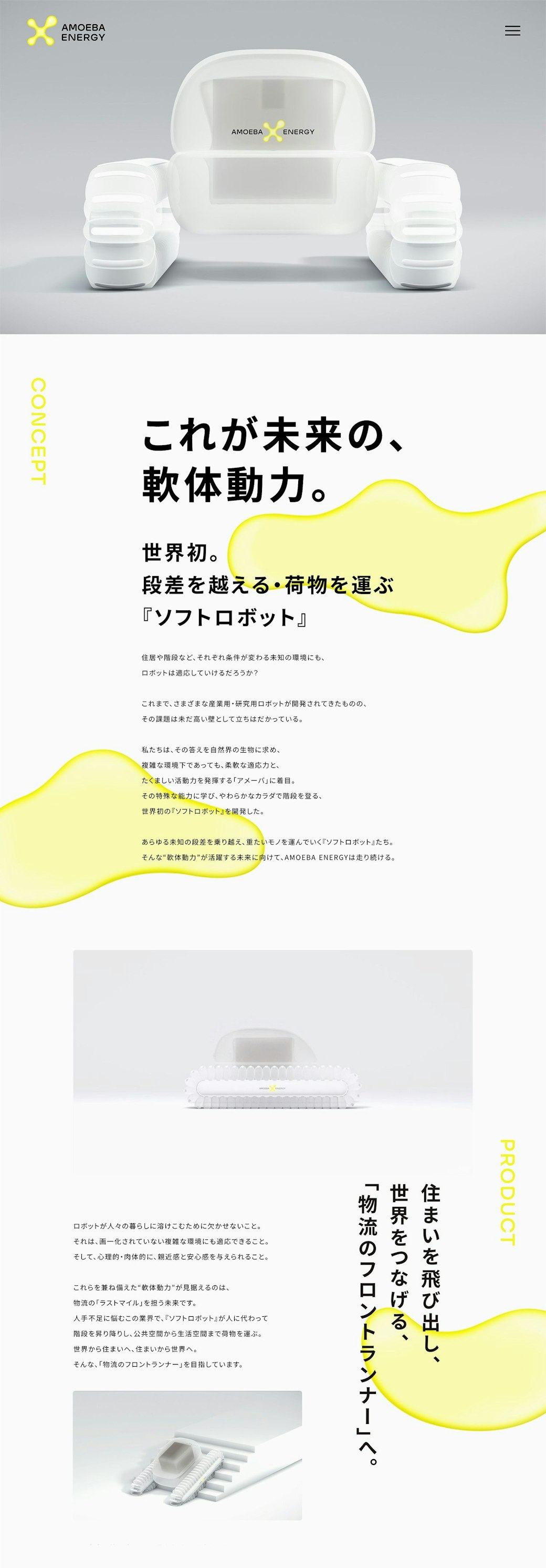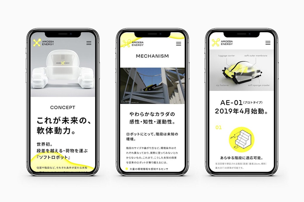 やわらかなカラダで階段を昇り降りできる、世界初の「ソフトロボット」の研究・開発を行うAMOEBA ENERGY社。その立ち上げに際して、ロゴマーク、コンセプトモデルのプロダクトデザイン、スローガン、ウェブサイト等を担当しました。