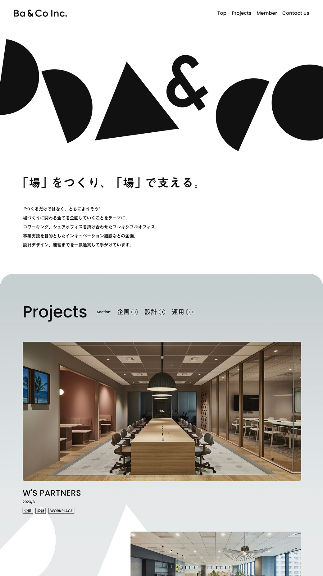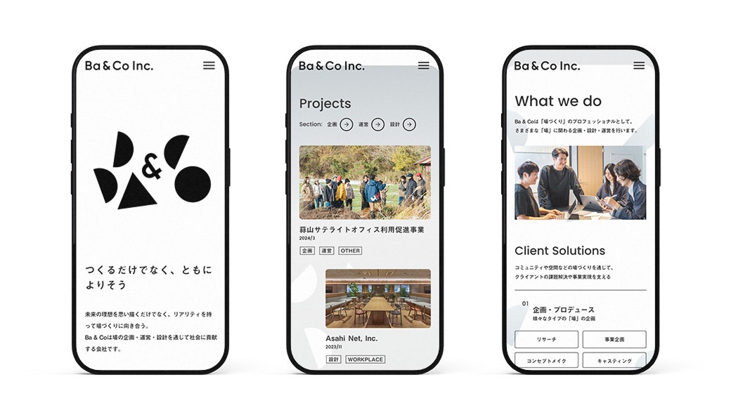 ツクルバから独立・分社化し、「場づくり」のプロフェッショナルとして、あらゆる“場”に関わる企画・設計・運営を行う会社として発進したBa&Coの新しいコーポレートロゴ・サイトを担当しました。 一見散らばったオブジェクトはよく見ると「B」「A」「C」「O」のアルファベットになっており、自由な積み木のように、集まったり積み上げたりしながら、“場”を共創していく。そんな想いや遊び心を詰め込んでいます。 また、遊び心あふれるモーションロゴが特長のコーポレートサイトはStudioにて制作しました。