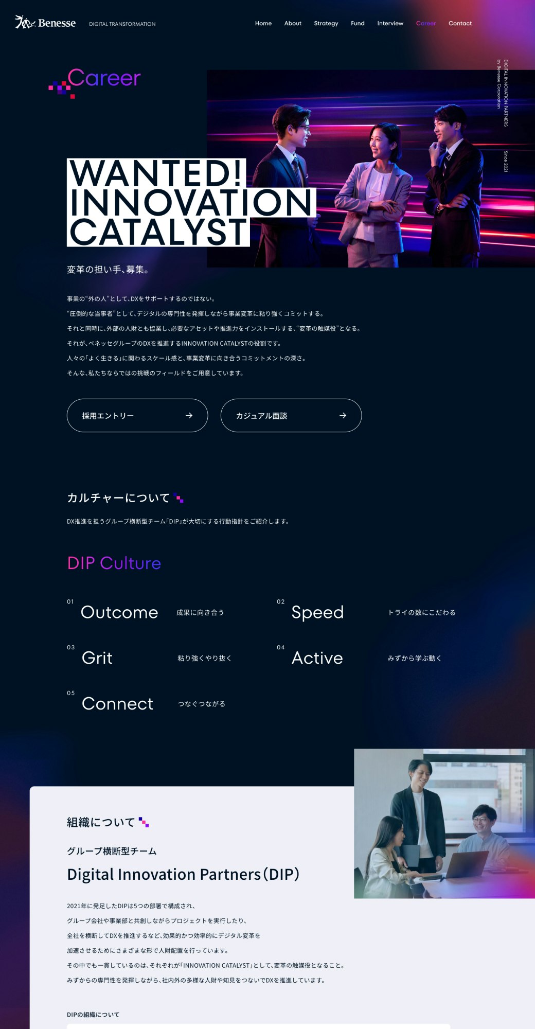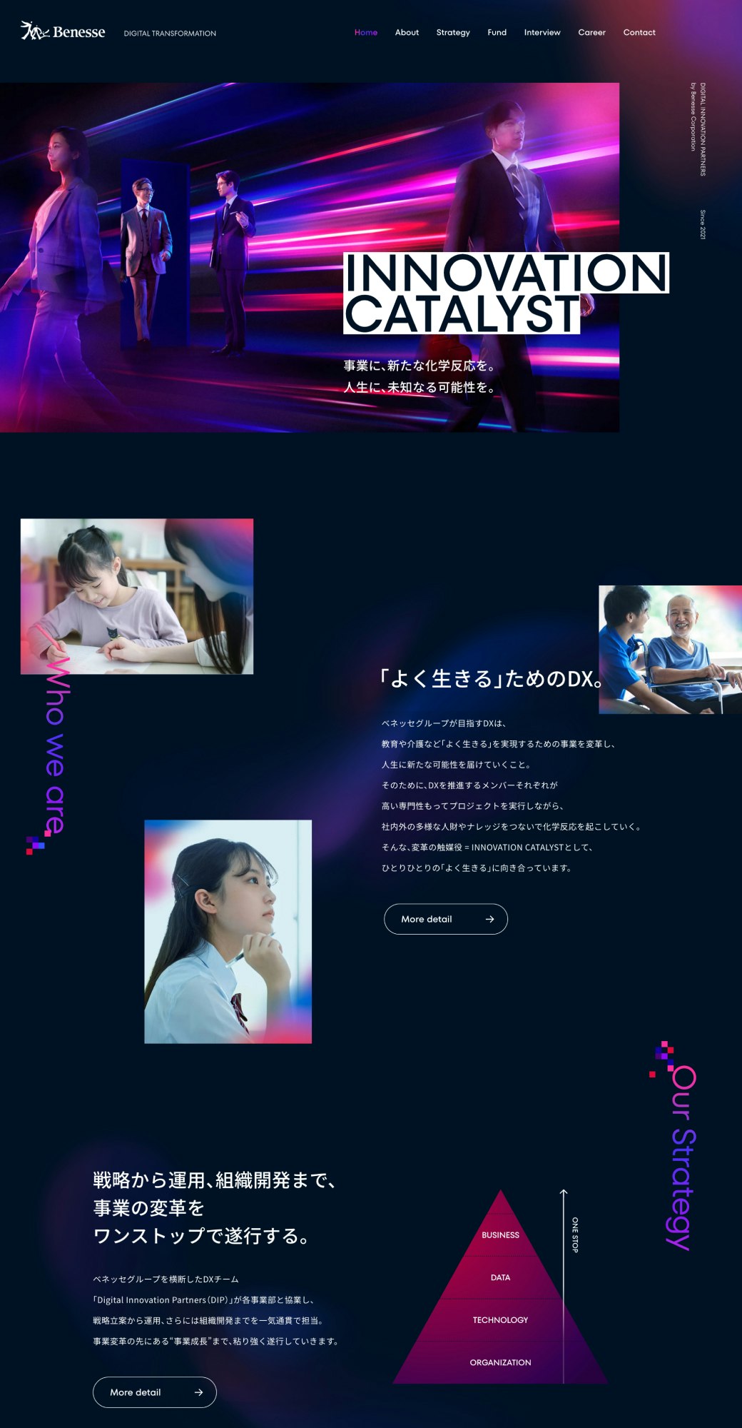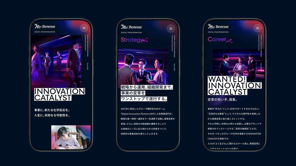 「ベネッセのDX戦略」のリブランディングにおいて、WEBサイトを中心とした企画・制作を担当。採用強化を主な目的として、社内メンバーへのヒアリングも重ねながらベネッセのDX推進の特長や、アプローチしたい人物像を深掘りしていきました。 これまでの長い歴史の中で培ったベネッセグループならではの社会性の高さに加え、DX推進を通じて事業変革に泥臭くコミットする力強い姿勢を訴求すること。そして、その担い手として、前向きにチャレンジし、事業成長と自己成長に意欲的に取り組むマインドをもった人財に魅力に感じてもらうこと。これらを目指し、「変革の触媒役 = INNOVATION CATALYST」と自己定義を言語化。事業に新たな化学反応を生み出し、それぞれの人生に未知なる可能性を届けるという展望を、サイト全体を通じてひも解いています。 さらにデザインにおいては、「“人の可能性”の拡張」をテーマとして設定。「INNOVATION CATALYST」の専門性や熱量による事業変革の推進力と、その先にある人々の「よく生きる」の実現の両面を共存させながら、先進性とスピード感のある世界観で描いていきました。