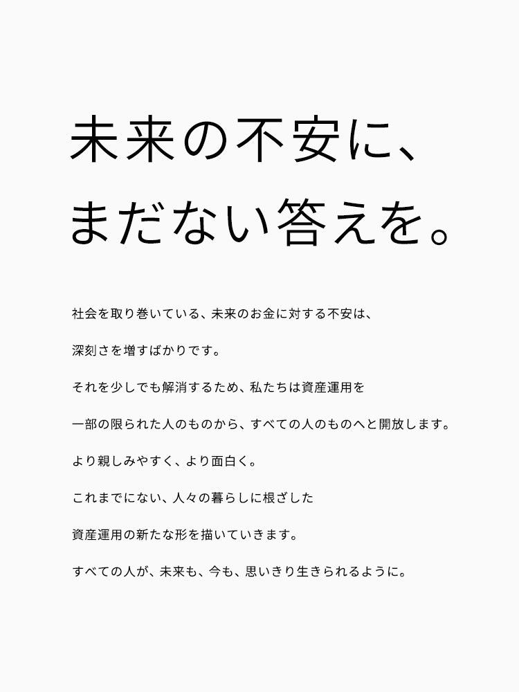 社会的な背景として、将来のお金に対する不安が取り巻いている中で、資産運用の選択肢を広げていきたい。そして、資産運用そのものを文化として根付かせ、ひとりひとりの将来の不安を少しでも解消していきたい。