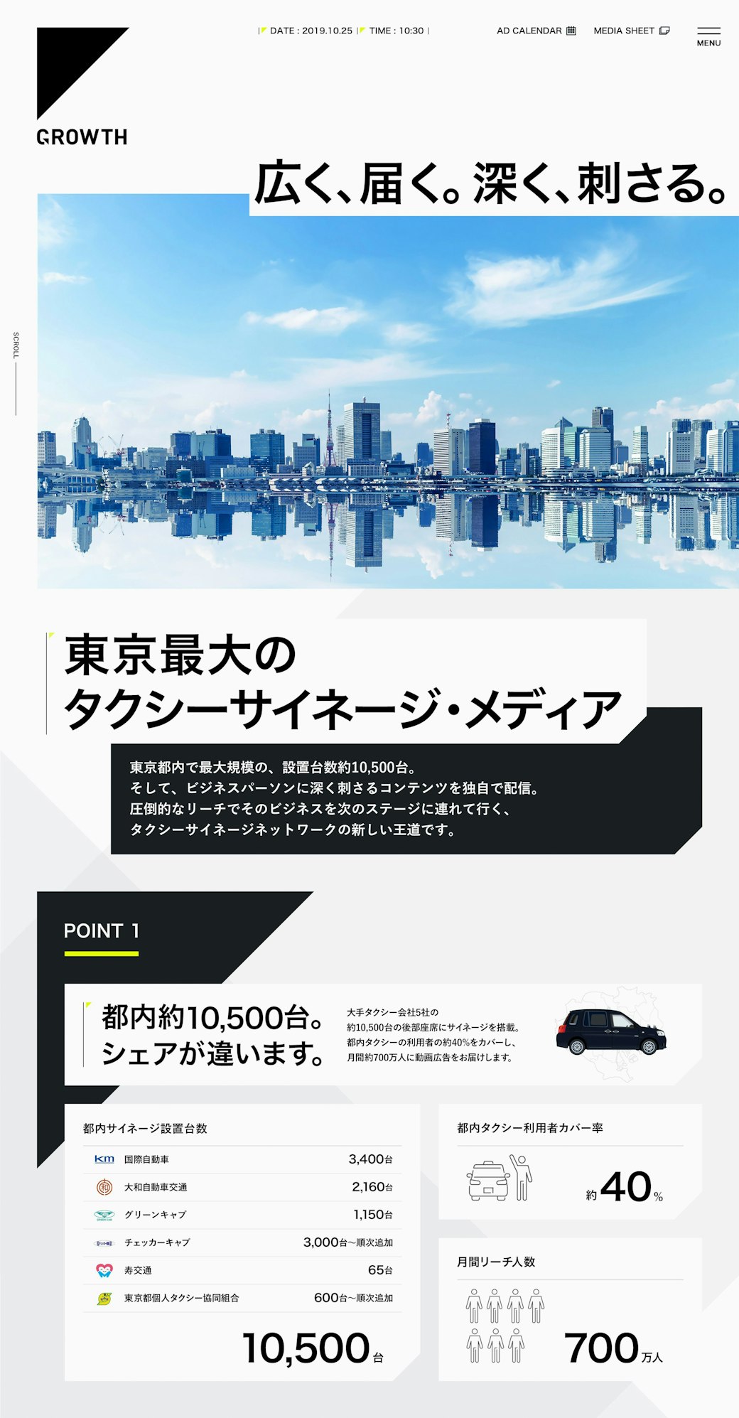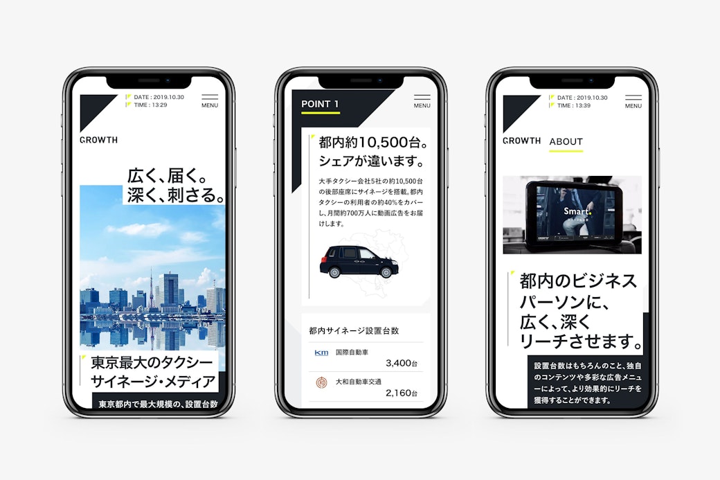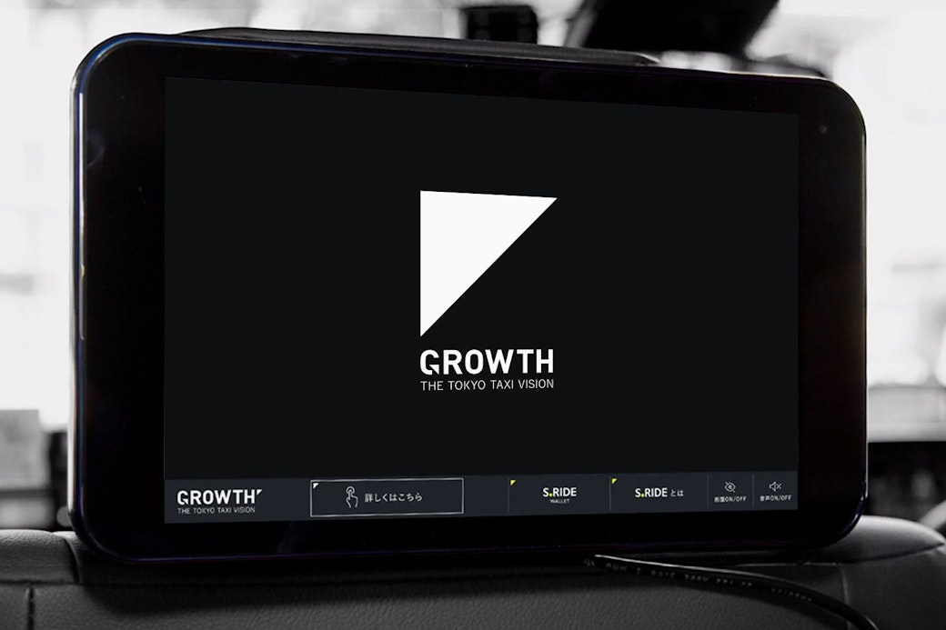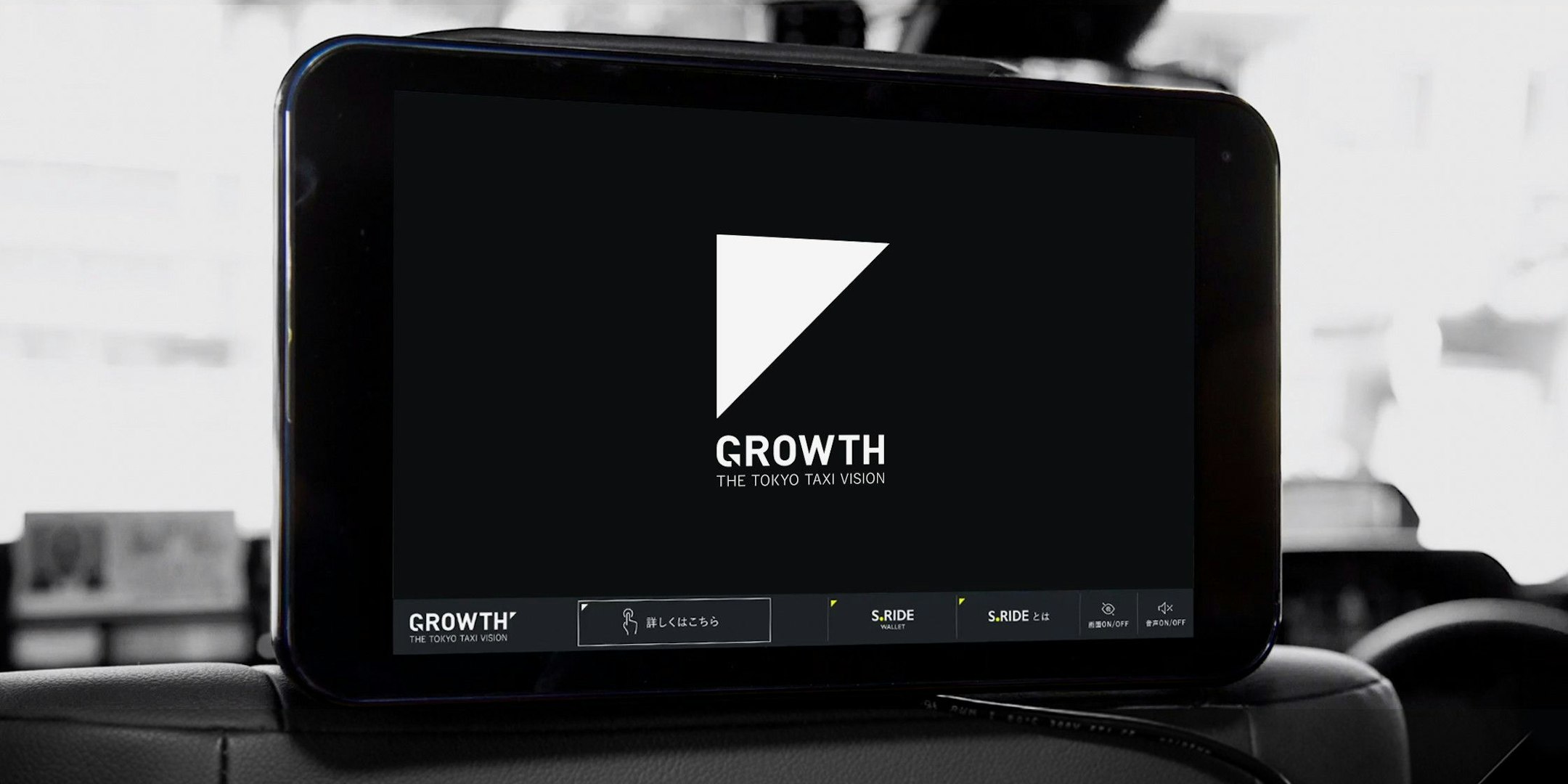 都内約10,500台のタクシーに導入されている、タクシーサイネージ・メディア『GROWTH』。その立ち上げに際し、ネーミング、ロゴマーク、WEBサイト、サイネージのUIなど総合的にお手伝いしました。