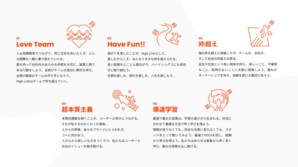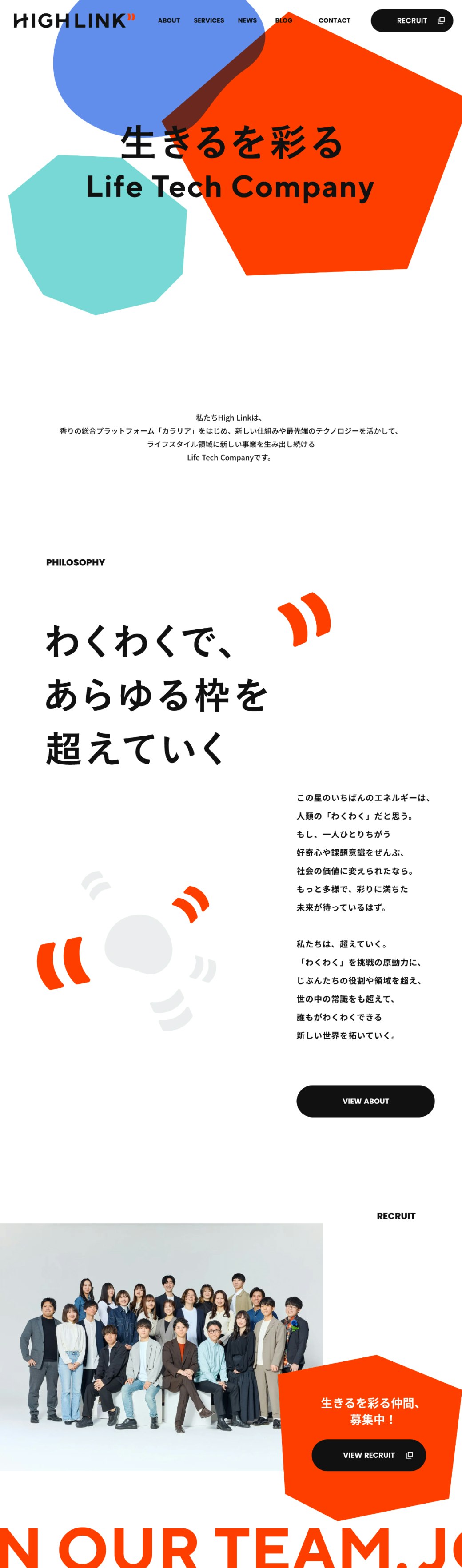 香りの総合プラットフォーム「カラリア」をはじめ、新しい仕組みや最先端のテクノロジーを活かして、ライフスタイル領域に新しい事業を生み出し続けるLife Tech Company、株式会社High Linkのコーポレートブランディングとして、 ・フィロソフィー/バリュー/スローガンの策定 ・CI/VIのリニューアル ・コーポレートサイトの作成 を担当しました。 「連続的に事業を立ち上げていく会社」として経営陣は思っているが、社内外ともに「カラリアを運営する会社」だとの認識が強い。目指す方向性が曖昧。そういった課題感をもってPARKにリブランディングのお声がかかりました。 何でもやれる可能性を閉じたくない、社会課題の解決や自分たちの存在意義を中心に据えるのは自分に嘘をついているような気がする。そんな経営者の声と向き合って、内に秘めた好奇心や進歩感を志す想いを「フィロソフィー」として定義し、会社のあり方をシェイプしていきました。その過程で、ライフスタイル領域のビジネスでチャレンジするという指針が見え、「生きるを彩るLife Tech Company」と自己定義を行い、今後の事業開発における軸を据えました。 ロゴは「わくわくで、あらゆる枠を超えていく」をストレートに表現したものに。WEBでの表現は「生きるを彩る」というメッセージをカラーフルなオブジェクトで表し、軽快で大胆な動きはハイリンクのアプローチの仕方を演出しています。 ◎あわせてこちらのインタビュー記事もご覧ください。 https://blog.high-link.co.jp/entry/park