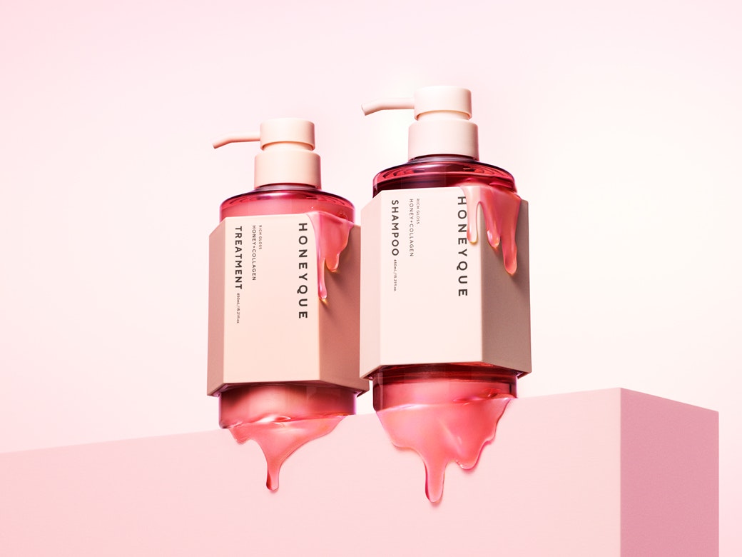 ヘアケアブランド「HONEYQUE」から新シリーズとして登場した「ハニーコラーゲン」シリーズの全体アートディレクションを担当しました。 前回の「鍛える蜜髪」に対し、ハニー×コラーゲンで「ぷるん輝く蜜髪」がコンセプト。コラーゲンから着想したぷるぷるのシズル感と、輝きあふれる新しいハニーの世界を描きました。