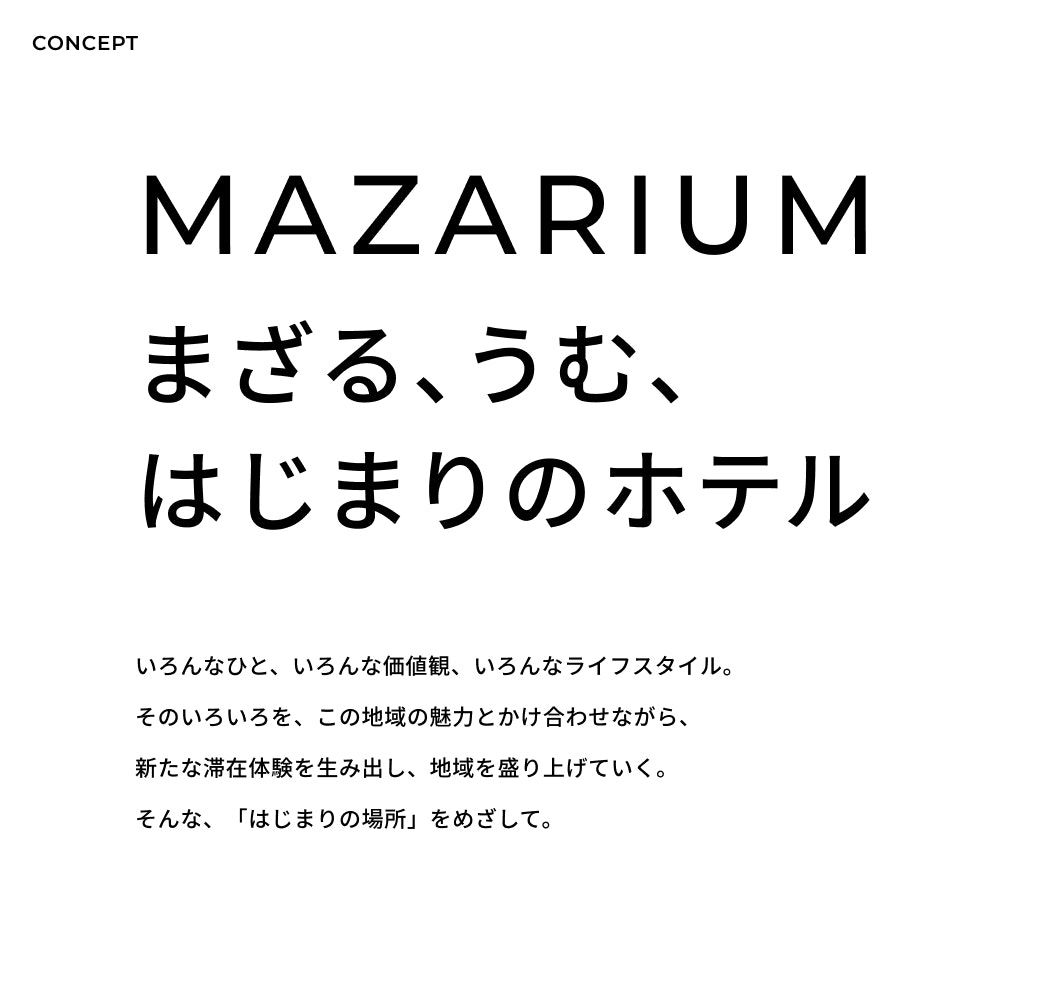 1960年から半世紀以上、市民のインフラとして親しまれてきた「盛岡バスセンター」。そのリニューアルに伴い、株式会社ヘラルボニーがアートプロデュースを手掛けるライフスタイルホテルが主要テナントのひとつとして新設。PARKはコンセプトメイクの担当としてチームに参画しました。 いろいろな人や、いろいろな価値観、いろいろなライフスタイルがまざりあう場所になるようにという想いのもと、「MAZARIUM -まざる、うむ、はじまりのホテル-」というコンセプトワードを策定。ホテルのネーミングとしても採用されるなど、発展性のあるコンセプトとなりました。