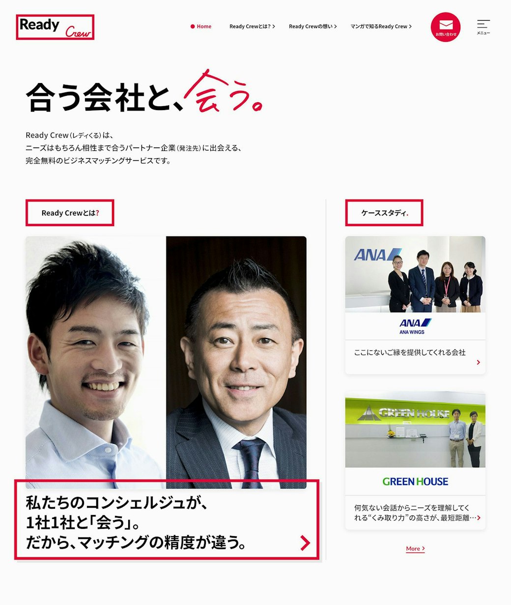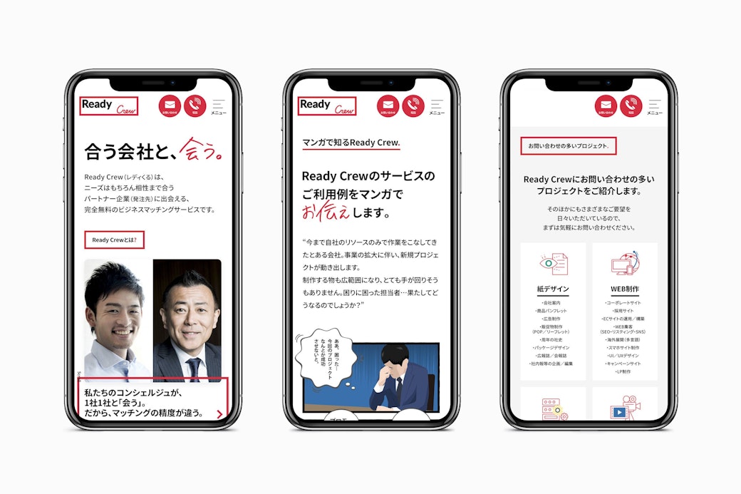 そこでサービスの価値を再定義を行い、「合う会社と、会う。」というスローガンを開発。サービス名も『LADY CREW(レディくる)』から『Ready Crew(レディくる)』に変更しサービスサイトや会社説明資料も一新することで、さらなる拡大の足場がためをお手伝いしました。