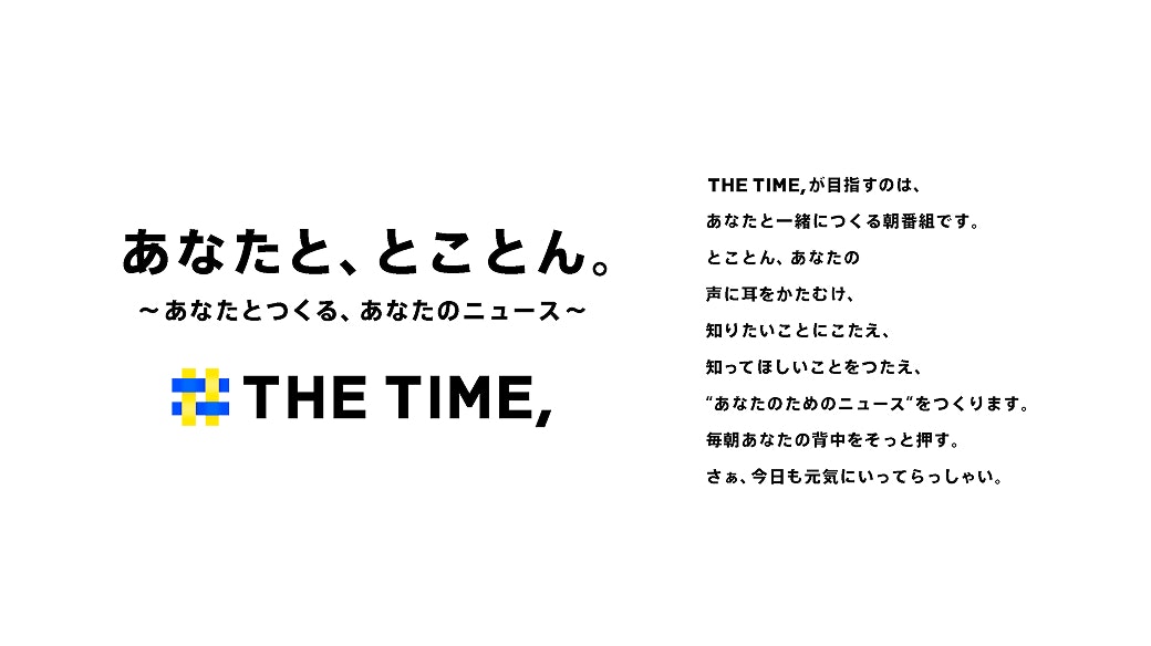 TBSテレビの朝の情報番組「THE TIME,」のコンセプトとロゴ、ビジュアルディレクションを担当しました。 ヒアリングとディスカッションを丁寧に重ね、番組の強みである視聴者と共につくる姿勢を決意をもって伝えることを目的に、「あなたと、とことん」というコンセプトコピーを策定。 また、ロゴやVIにおいても、視聴者と共に番組を紡ぎ、無限に輪が広がっていくさまをツートンカラーの編み込みをモチーフに制作しました。映像・モーションは株式会社ナナメが担当。