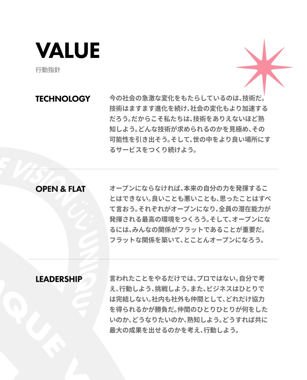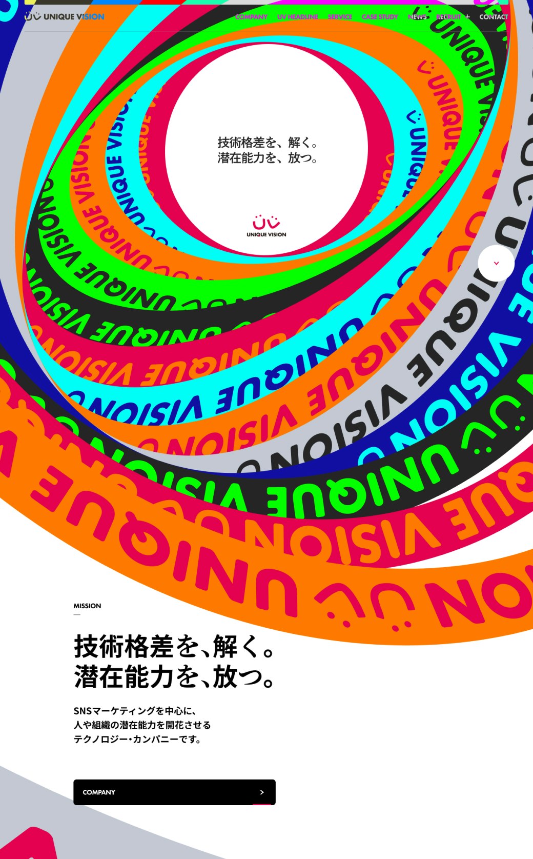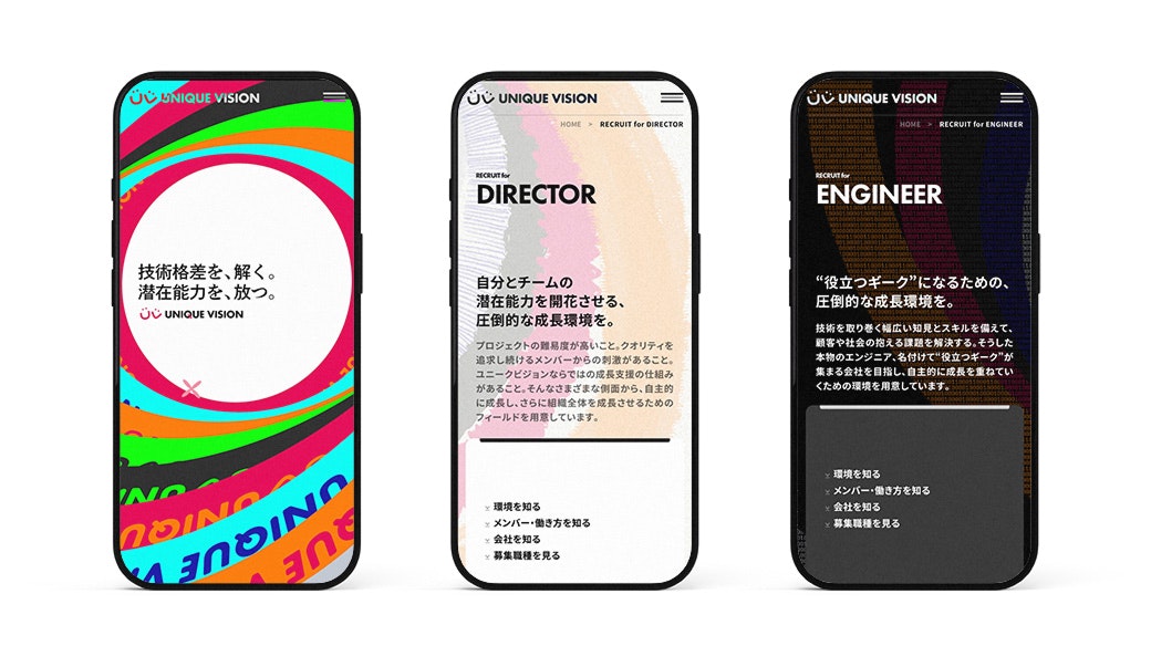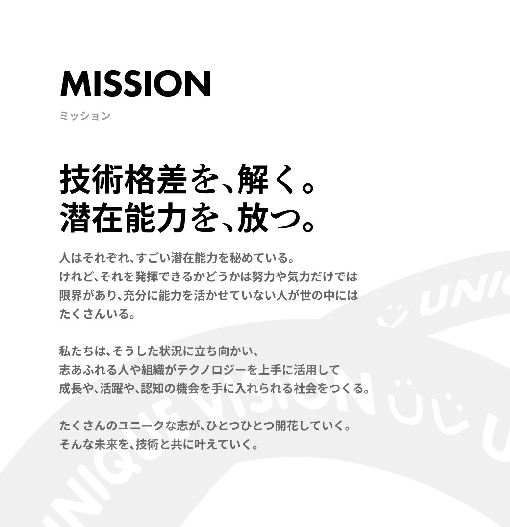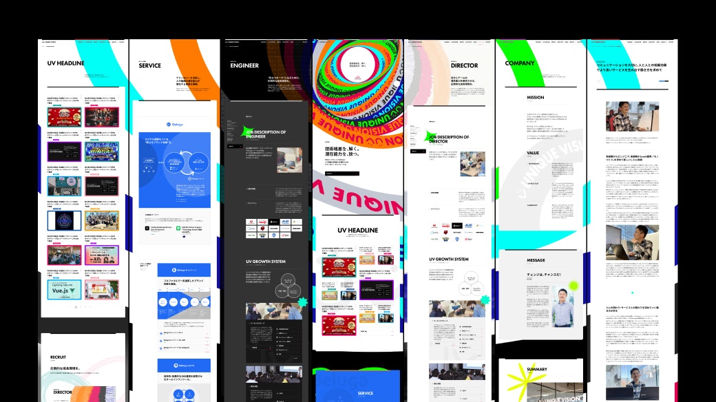 SNSマーケティングツール「Beluga」シリーズの開発・運用を行うユニークビジョン株式会社のリブランディングに際して、ミッションの策定とコーポレートサイト制作を担当しました。 今後、自分たちは社会に対してどのような存在になっていきたいのか?という問いからスタートし、誰もがテクノロジーを活用し、人や組織の可能性を解放できる存在という方針をディスカッションを通じて整理しました。そして、それを表現するワードとして、「技術格差を、解く。潜在能力を、放つ。」というミッションを策定しました。 さらに、ミッションを体現するコーポレートサイトでは、「ビッグバン」をテーマに設定。さまざまな個性(人や組織)の潜在能力が解き放たれていくさまを、ページを横断するような巨大な円環のグラフィックと、無限の広がりを感じさせる演出・実装で表現しました。
