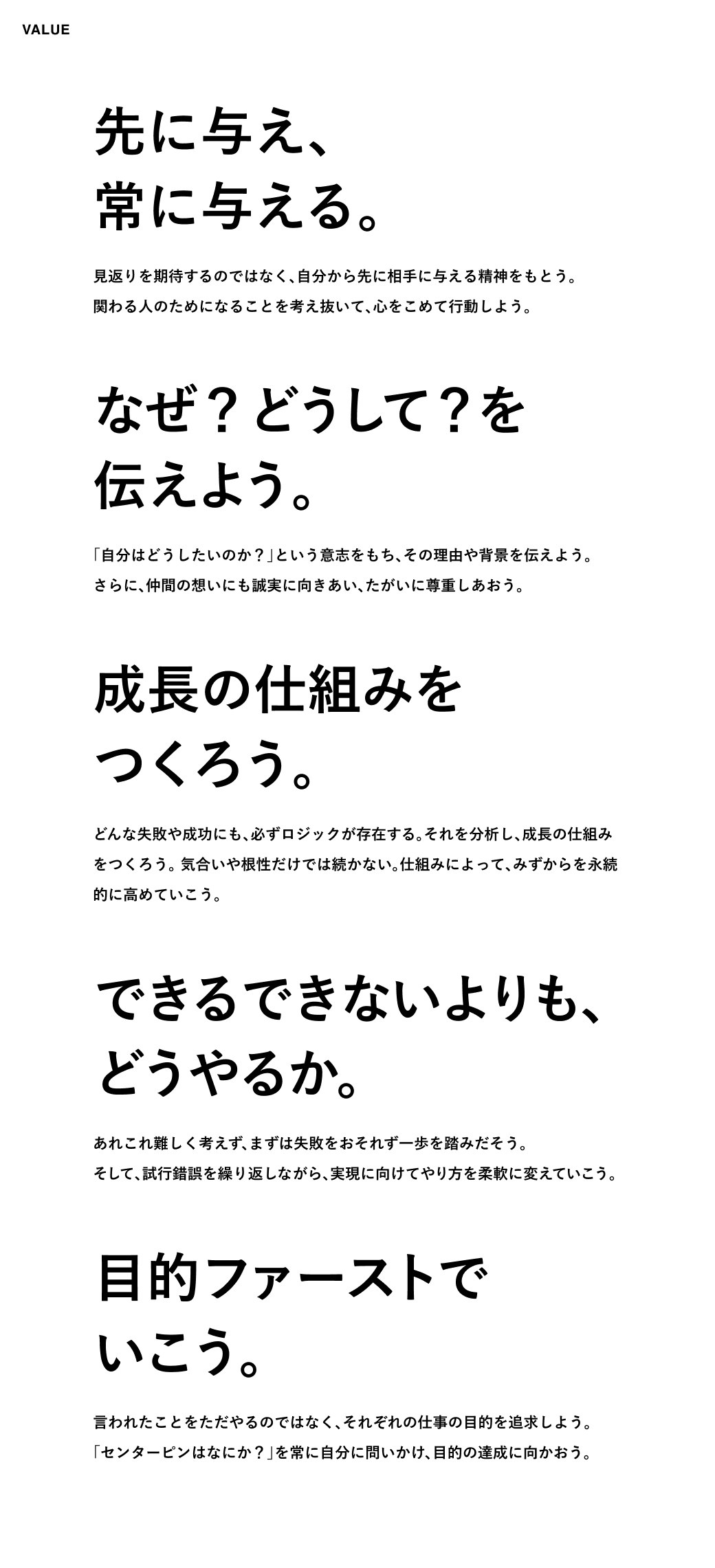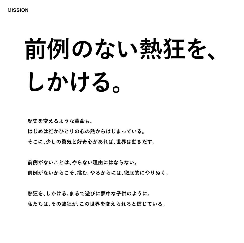 社内のみなさんの中で日頃キーワードとして飛び交っていた「熱狂」という言葉を活かし、「前例のない熱狂を、しかける」というミッションと、それを体現するためのバリューを開発。