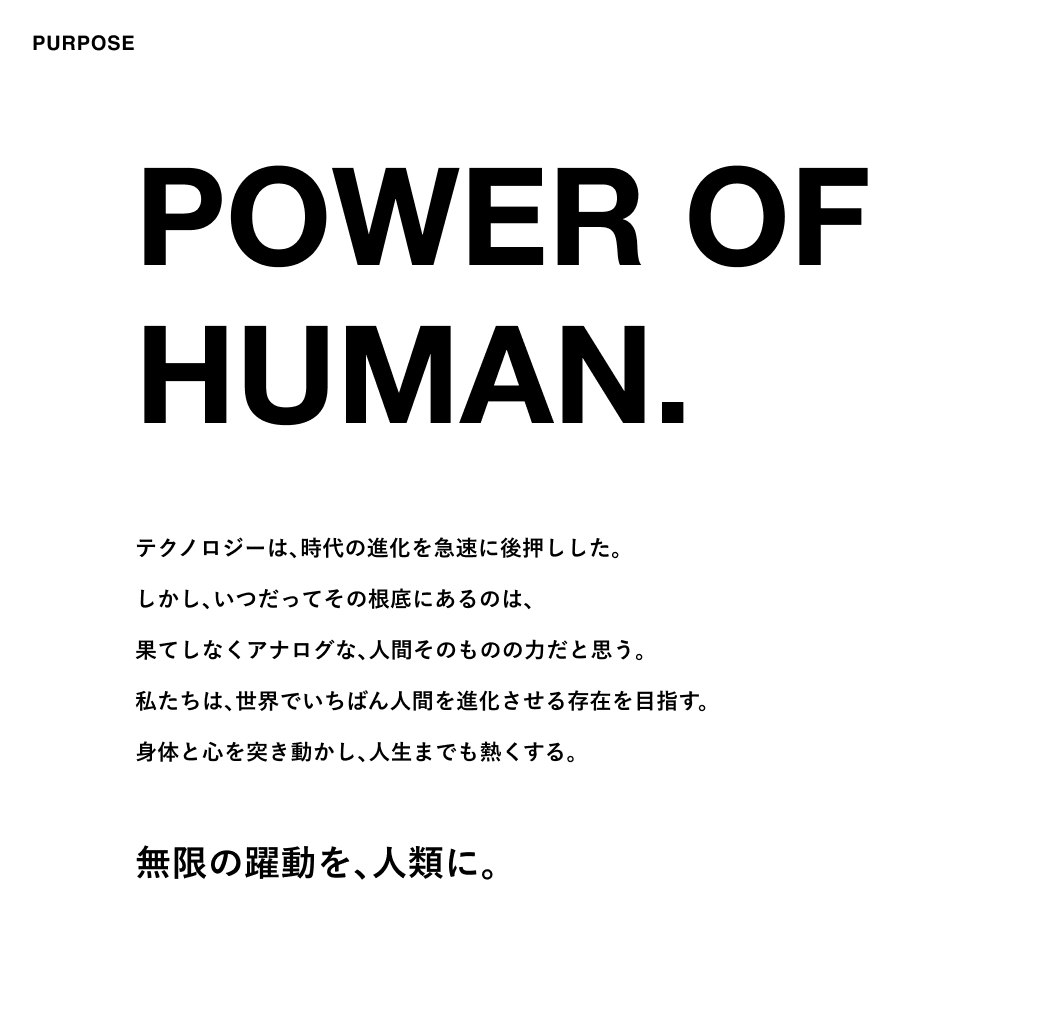 パーパスでは、「心身の活力(エナジー)が最大化される社会をつくる。」という想いと、今後世界進出を加速させ、価値提供を広げるという展望をふまえ、「POWER OF HUMAN.」というワードを開発しました。