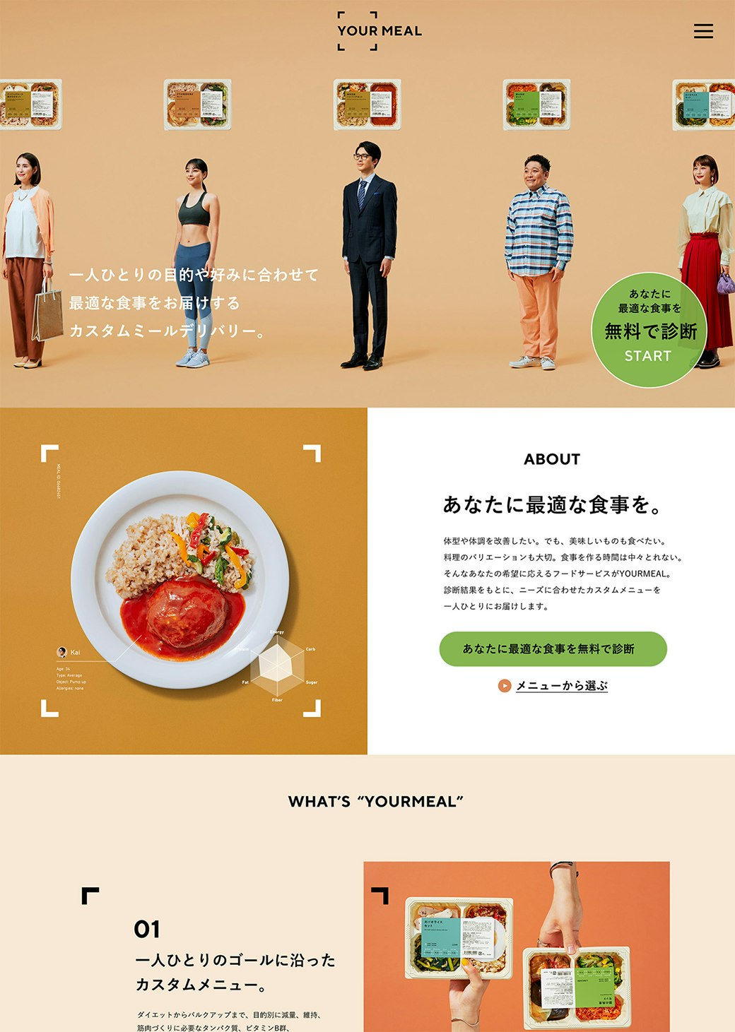 ひとりひとりの目的や好みに合わせて最適な食事を届けるカスタムミールデリバリー「YOUR MEAL」のコンセプト、全体アートディレクション、ネーミング、サービスコピーを担当しました。 食事のカスタマイズ性が分かりやすく伝わるサービス名を採用、サービスロゴも、個人へのフォーカスをイメージした括弧をシンボルに採用。デザインエレメントとしても活用し、カスタムミールであることをより印象づけました。 また、一部の健康意識が高い人だけでなく誰もが習慣化したくなるようなサービスになるよう、ストイックでない、ポジティブでフレンドリーな世界観を目指しました。