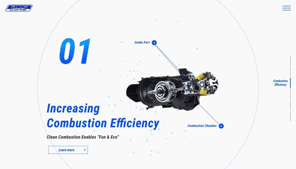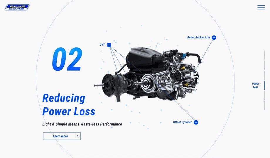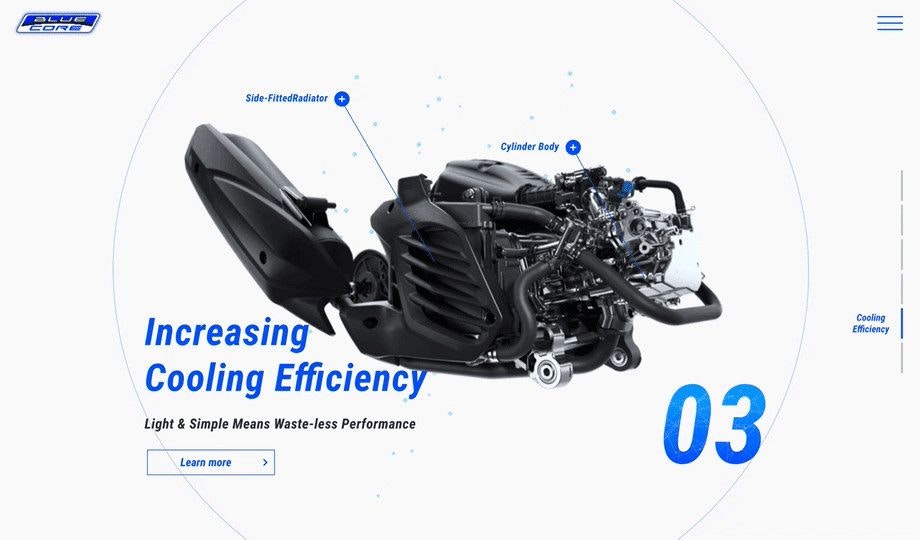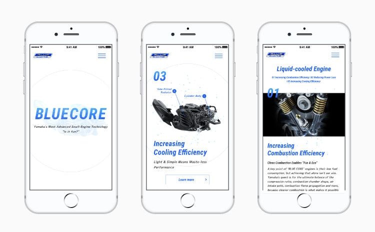走りの楽しさと燃費・環境性能の両立を高次元で具現化するという思想に基づいたYAMAHAの次世代小型エンジン“BLUE CORE (ブルーコア)” のグローバル向けブランドサイトの企画からUI設計、アートディレクションを担当しました。