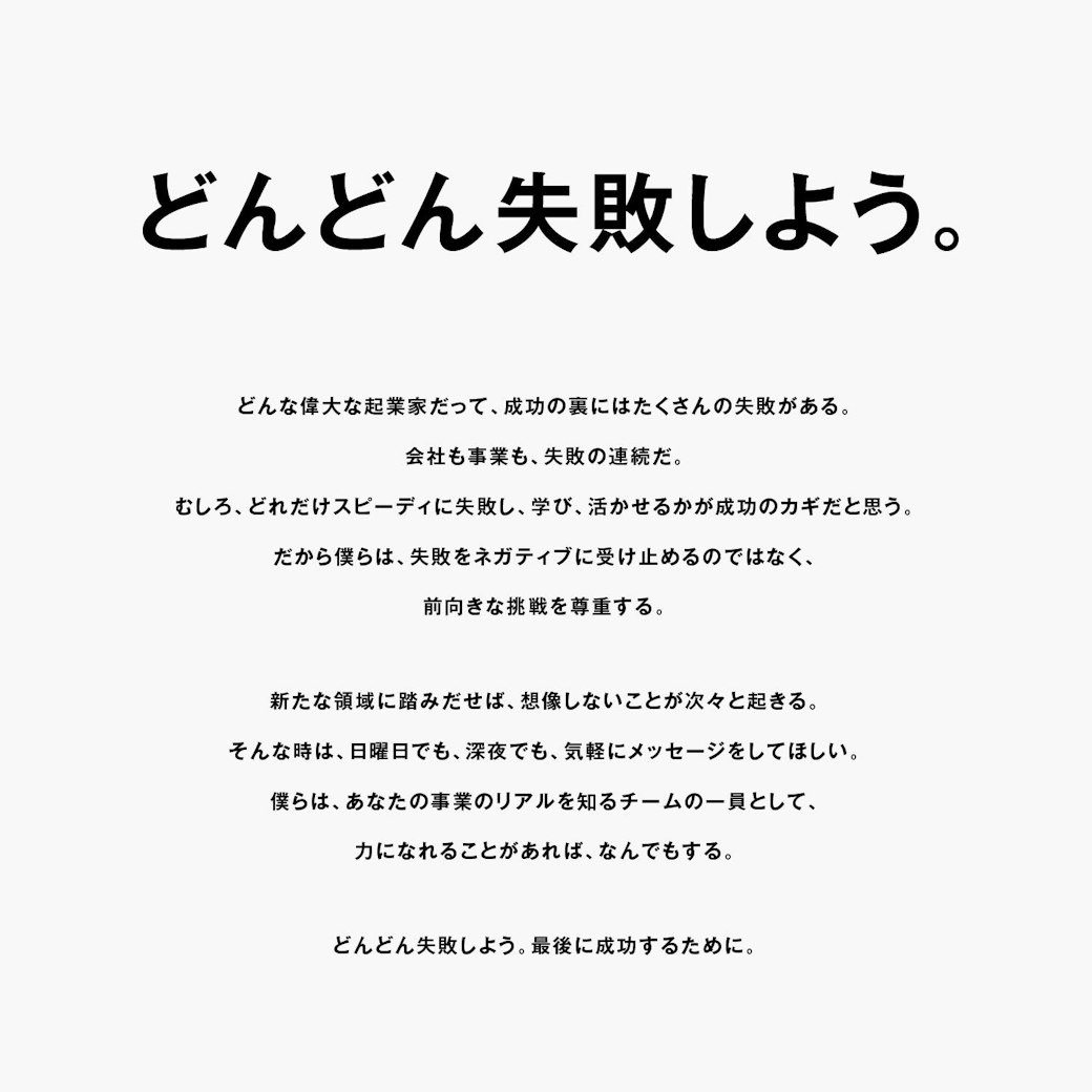 VCという属人的な領域において独自の存在感を放つため、徹底的に「法人格」に寄り添ったブランドづくりを追求。起業家にもっとも近い存在として、二人三脚で成功へと進むといった姿勢をもとに「W ventures」というネーミングや、「どんどん失敗しよう。」というスローガンを策定。